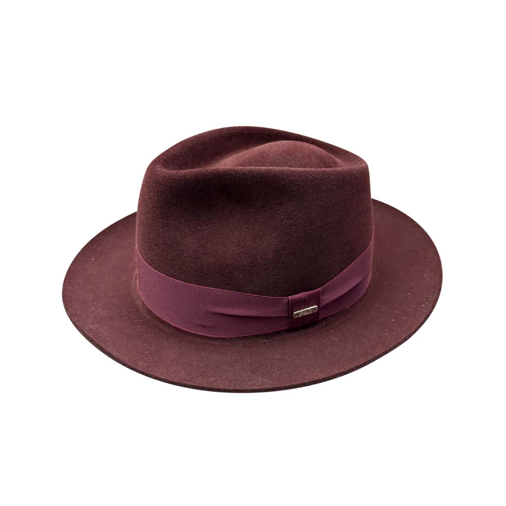 The Limited Edition Cosme Teardrop Fedora by Fernández y Roche features a special color – merlot! It is a classic hat made of quality fur felt. It has a water drop crown, decorated with a grossgrain ribbon with a classic bow. There is a leather sweatband that makes it very comfortable. Handmade in Spain.